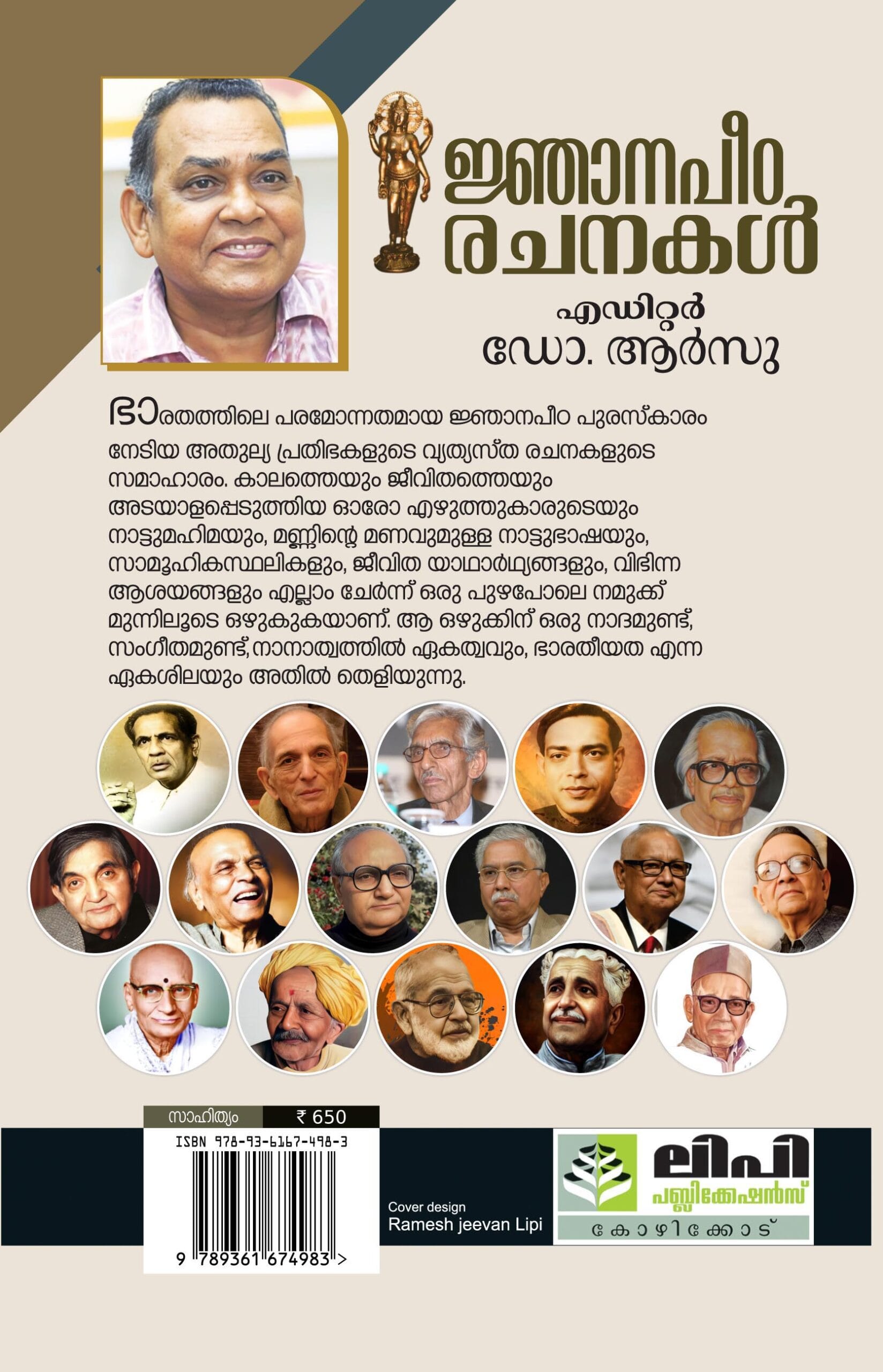 ഭാരതത്തിലെ പരമോന്നതമായ ജ്ഞാനപീഠ പുരസ്കാരം നേടിയ അതുല്യ പ്രതിഭകളുടെ വ്യത്യസ്ത രചനകളുടെ സമാഹാരം. കാലത്തെയും ജീവിതത്തെയും അടയാളപ്പെടുത്തിയ ഓരോ എഴുത്തുകാരുടെയും നാട്ടുമഹിമയും, മണ്ണിന്റെ മണവുമുള്ള നാട്ടുഭാഷയും, സാമൂഹികസ്ഥലികളും, ജീവിത യാഥാര്ഥ്യങ്ങളും, വിഭിന്ന ആശയങ്ങളും എല്ലാം ചേര്ന്ന് ഒരു പുഴപോലെ നമുക്ക് മുന്നിലൂടെ ഒഴുകുകയാണ്. ആ ഒഴുക്കിന് ഒരു നാദമുണ്ട്, സംഗീതമുണ്ട്, നാനാത്വത്തില് ഏകത്വവും, ഭാരതീയത എന്ന ഏകശിലയും അതില് തെളിയുന്നു.